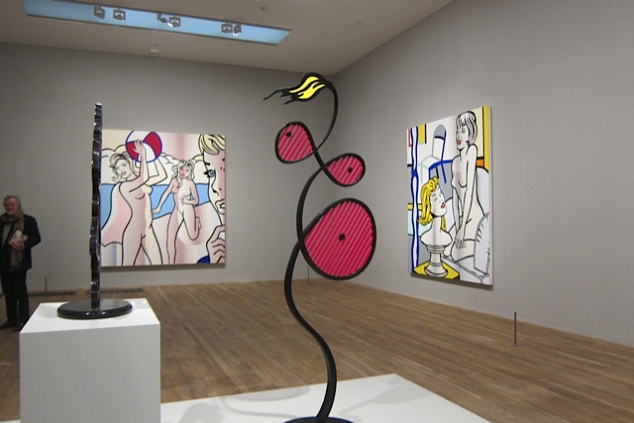 Nonostante possa essere definito senza indugio il più fedele rappresentante della Pop Art, dietro all’opera del pittore americano c’è molto di più, un approccio estremamente consapevole e ironico con i mass media. Nel pieno dell’“era della riproducibilità tecnica”, Lichtenstein traspone “manualmente” tutto ciò che può essere riproducibile attraverso una pittura nuova, di impatto visivo fortissimo: grandi formati, utilizzo di una palette di colori primari, contorni neri e puntini di Benday per enfatizzare sfumature e ombre. Nella prima sezione – Brushstrokes – si può leggere tutta la parodia nei confronti dell’espressionismo astratto di Jackson Pollock e Willem de Kooning, qui visto non come action painting ma come gesto estremamente ironico e controllato. Il grande ingresso nell’aura pop avviene con Look Mickey del 1961, presente nella sezione Early Pop. Ancora degli anni ’60 la serie Black and White, mentre risalgono alla collaborazione con Leo Castelli le opere del periodo War and Romance inspirate al comic book All American Men of War and Girl’s Romances, dove vengono messi in luce tutti i cliché della cultura popolare americana, in questa sezione lo splendido Whaam! (1963) acquisito dalla Tate nel 1966.