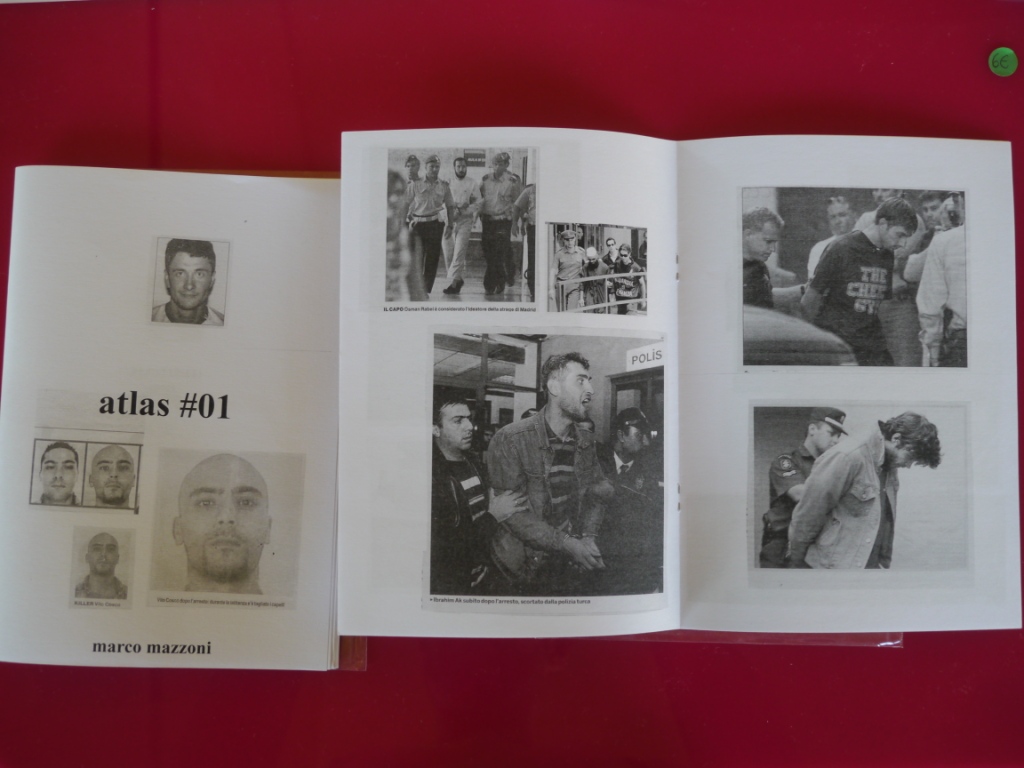 È omonimo dell’eccellentissimo pittore – così lo definisce Camillo Langone – finalista al Premio Cairo un paio di anni fa, ma non centra nulla con la scena milanese in cui questo si muove. Il Marco Mazzoni che porta a Fruit la sua serie Atlas è un po’ più grande d’età e affianca il proprio percorso nelle arti visive con l’impegno nella danza e nel teatro sperimentale: in veste di co-fondatore del collettivo Kinkaleri, in scena proprio in questi giorni al fianco del beatnik John Giorno al Festival Internazionale della Creazione Contemporanea. Divagazioni a parte gli atlanti di Mazzoni sono piccoli album di ritagli, fanzine monotematiche che affidano all’esclusiva ed esplosiva potenza dell’immagine narrazioni di cronaca contemporanea. Senza il filtro estetizzato dell’artista, ma pescando proprio là dove l’informazione nasce, cresce e muore. Dalle pagine dei giornali, con foto in bianco e nero che sommano patchwork di lamiere incastrate e facce da galera, scene del crimine e rovinosi incidenti.
