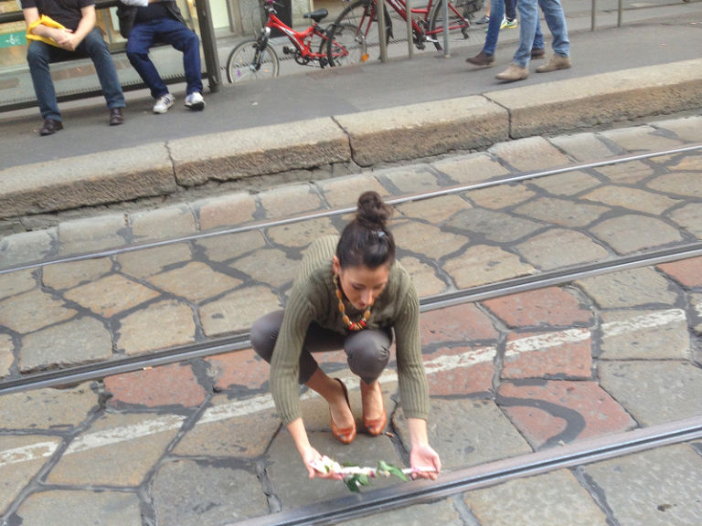 La definisce guerriglia gentile. Ossimoro che si sposa con straordinaria efficacia lessicale ad un’azione che è insieme violenta e delicata: brutale nelle forma, poetica nella sostanza. Lo scenario è quello della Milano più frenetica, nel mezzo di un sabato pomeriggio che è per definizione dedicato alla consultazione compulsiva delle vetrine, al fruscio dei sacchetti, a quell’ingombro di scatole e scatolette che non trova soluzione di continuità nemmeno sotto crisi. Mirko Canesi porta la sua riflessione sull’estetica del contemporaneo in pieno shopping time, con un piccolo bombardamento olfattivo. La complicità arriva da una profumeria nel centro della città, che contribuisce a creare piccole sfere di plastica riempite di essenze, legate a una rosa da trame di tessuto: sono prevalentemente – naturalmente! – donne le protagoniste della performance, clienti e semplici passanti invitate a trasformarsi in sediziose ma innocue bombarole. Abbandonando i fiori, assunti a multiplo d’artista, sulle rotaie dei tram o sulla traiettoria delle ruote di auto in sosta: il passaggio dei mezzi rompe l’incanto, devasta il fiore e strappa la stoffa, distrugge e tritura. Ma spezzando le piccole ampolle diffonde le essenze profumate, giocando sul potere della memoria olfattiva, spandendo aromi che ingentiliscono anche la soffocata aria schiacciata dalle polveri di città. Effluvi effimeri destinati a durare lo spazio di pochi attimi, ma chiamati a sedimentarsi nel ricordo.