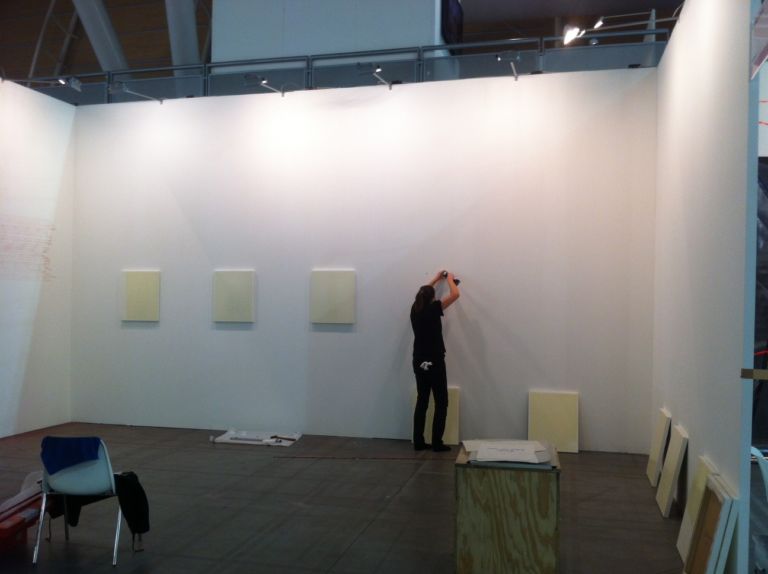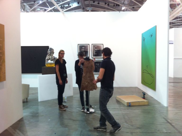 Scalandrini dall’equilibrio instabile, trapani in funzione, imballaggi utilizzati come improvvisavi tavoli. La sera prima dell’opening della fiera, è tutto un frenetico affrettarsi a popolare gli stand: ma facendo lo slalom fra dipinti ancora sdraiati a terra e sculture inviluppate da teli, una prima impressione è facile farsela. Noi non abbiamo resistito e ci siamo infilati dietro le quinte di Artissima: con qualche sosta più prolungata negli spazi di Present Future ed in quelli – straordinari, cercateli nella fotogallery – di Back to the Future. Grande occasione per vedere artisti non propriamente usuali, dal grande Ulay a Brian O’ Doherty…