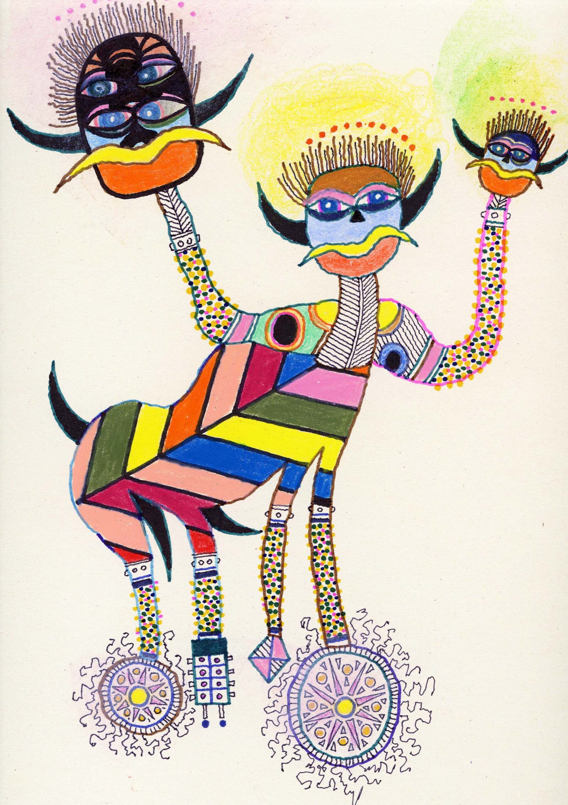 A completare il progetto espositivo ci sono, sull’altro fronte, i disegni. Realizzati su cartoncini 35×25 cm, con pennarelli, penne biro e matite colorate, i Mostri mescolano elementi molteplici, spesso lontanissimi, in un pastiche postmoderno che amplifica l’idea del repertorio visivo, del frammento, della mescolanza e della rielaborazione creativa: dentro ci sono i pittori naif dell’Amazzonia, gli espressionisti e i simbolisti, il cubismo, Savinio, la decorazione cinese e una galleria di segni ed utopie personali.