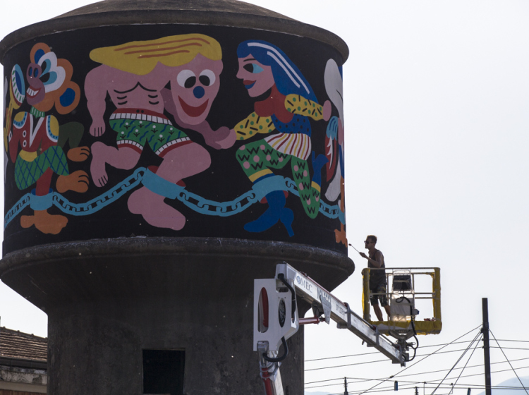 L’abbiamo visto arrampicato per giorni su un’autogru per “pittare” la cisterna della stazione di Fabriano, e ora la coloratissima “catena dell’evoluzione”, scanzonata interpretazione della teoria di Darwin di 3ttman (1978, originario di Lille, Francia, di stanza a Tenerife con un cuore nomade che lo ha portato a verniciare pareti di tutta Europa), svetta e apre le danze del Festival Pop Up, la kermesse marchigiana di “arte contemporanea nello spazio urbano”, che, dopo aver animato il porto di Ancona negli anni passati, guarda la provincia. L’opening fabrianese coniuga intrattenimento e contenuti: tra jazz e dj set in un’area anomala per una festa, in un vecchio vagone trova posto il bookshop indipendente Kindustria, ed i vecchi uffici FS, allestiti da Lucia Bramati, ospitano in prima assoluta la mostra Ri-fatto, dedicata all’omonima rubrica curata da Matteo Maffucci e David Daviù Vecchiato per Il Fatto Quotidiano, in cui le elaborazioni grafiche di immaginari interventi di urban art su strutture urbane abbandonate sparse per lo Stivale ad opera di noti street artists ne denunciano l’ingombrante presenza in paesaggi e territori. Dopo Fabriano la manifestazione si sposta nei giorni seguenti anche, e non solo, in altre stazioni della stessa linea ferroviaria in direzione Ancona: intanto, ecco le immagini della prima giornata…
