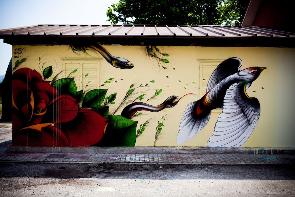 L’idea di un festival di muralismo nasce da una proposta di Ericailcane. È suo il muro sul quale un cervo dal piglio fiero, animale-simbolo delle aree montane, indica la strada evidenziando il cartiglio che porta il nome del posto. Molti i lavori che riprendono temi legati alla natura: l’uomo arborescente di Andrea Casciu, il gufo e il cigno di Hitnes, che si fanno largo nel fitto fogliame, i voli sinuosi di serpi e uccelli dipinti da Dorian Serpa, o l’infinita danza esoterica delle bestie di DEM.