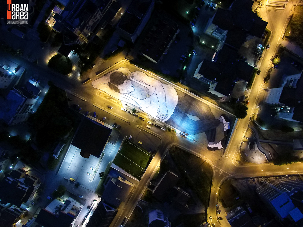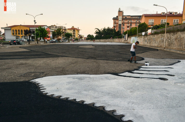 Grazie all’associazione a.DNA project, i due street artist sono giunti in Italia per produrre un lavoro site specific nel comune di Quadrivio di Campagna, in provincia di Salerno. A cambiare volto, radicalmente, è Piazza “Angeli della Strada”, conosciuta come “Piazza Mercato”. Un luogo sottratto ai residenti, da troppo tempo: finito il mercato del lunedì, qui la routine era fatta di traffico, frastuono, parcheggi, vandalismi, rumori molesti in piena notte. Una piazza negata, in cui era impossibile giocare, passeggiare, viversi un angolo di quiete. Complessivamente 3600 mq – 120 metri per 30 – in attesa di un progetto di pedonalizzazione.