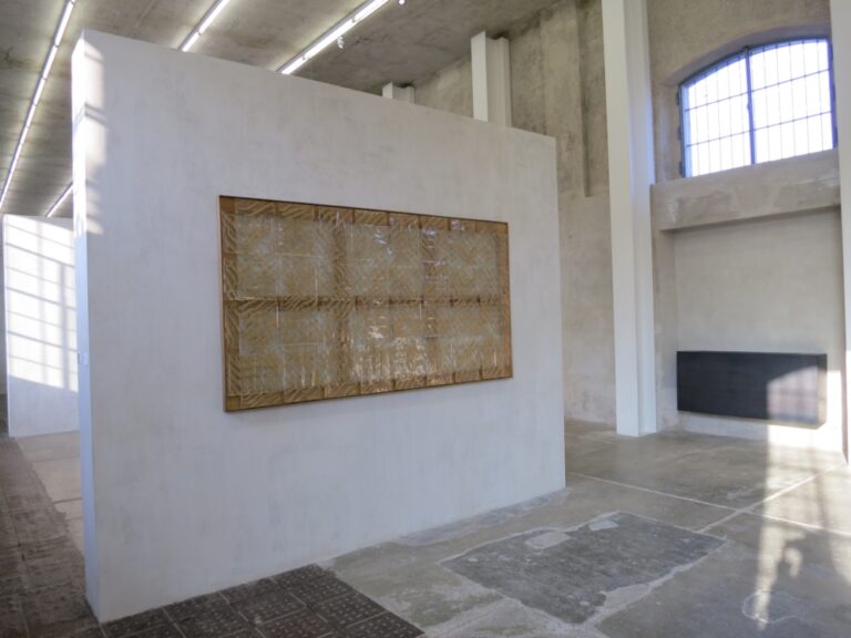 Nei lunghi spazi della Galleria Nord che costeggia l’ingresso della Fondazione Prada, Recto Verso si presenta come una mostra calata in se stessa, un itinerario da ispezionare, tra lavori che si rivelano ad ogni passo ed estemporanee storiche, singolarità con un doppio senso di lettura. Il percorso tematico, infatti, sdoppia la portata della superficie compositiva per mostrare artefatti frontali inscindibili, concettualmente e formalmente, dai loro risvolti (verso), permettendo allo sguardo del pubblico di accedere a una superficie privata, visibile solo all’artista e agli addetti ai lavori. Una ventina di lavori in tutto, tra formati medi e grandi dimensioni. Alcune superfici sono state montate, sospese a sottili cavi d’acciaio, tra le pareti serrate che suddividono lo spazio espositivo, come nel caso delle combustioni di Burri e nelle tele sovrapponibili di Paolini.