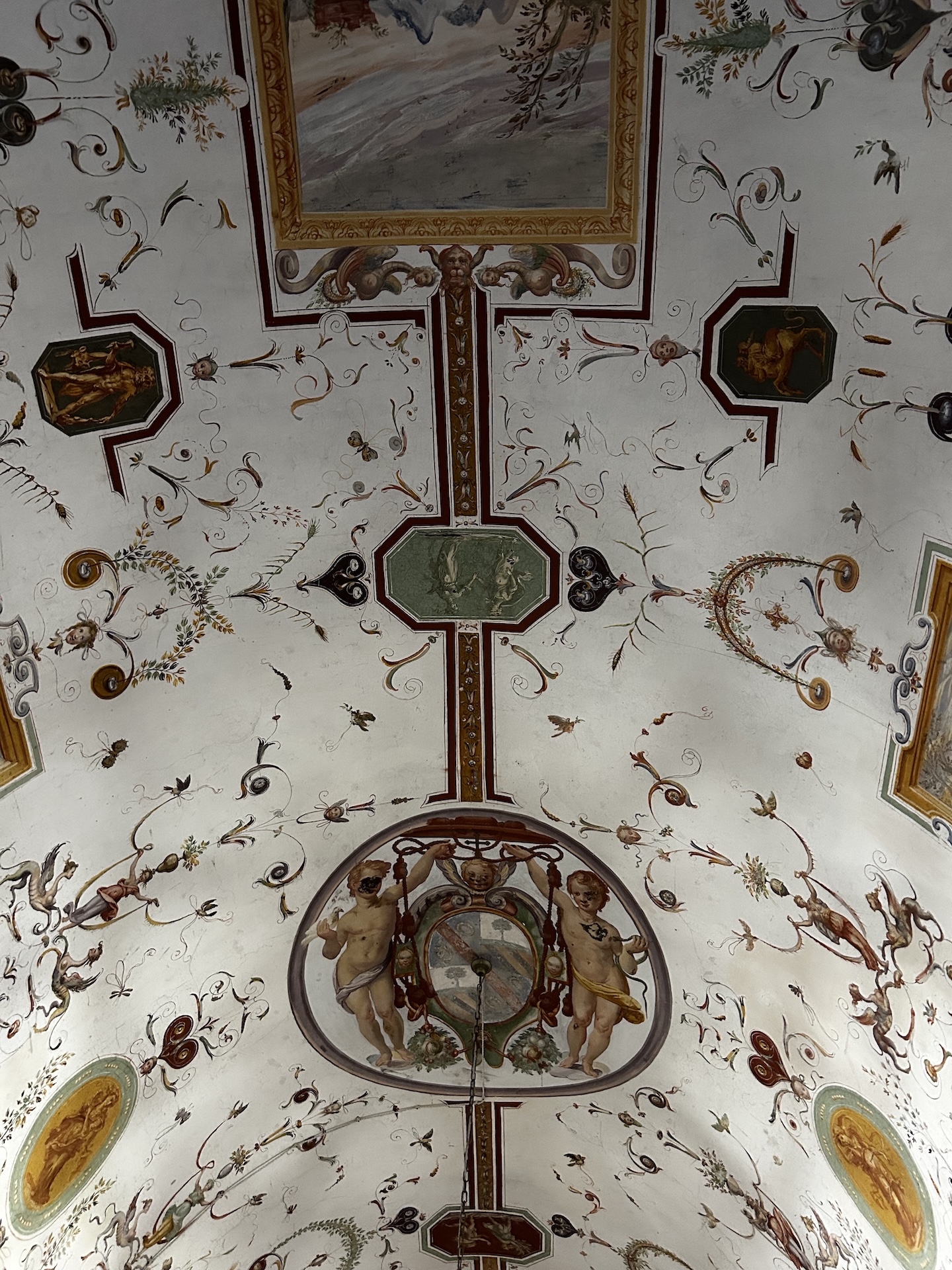 Ma concludiamo con quello che racchiude l’interno della Villa del Colle, che non sfigura affatto rispetto al giardino. Due piani quasi completamente visitabili, in cui si percepisce ancora l’atmosfera del vivere nel Cinquecento. In ogni stanza la testa si orienta involontariamente verso l’alto: verso i soffitti affrescati. È tutto un rincorrersi di grottesche di ogni tipo e forma. Un vocabolario di simbologie estremamente vario, che si accosta a scene di genere e sacre.
